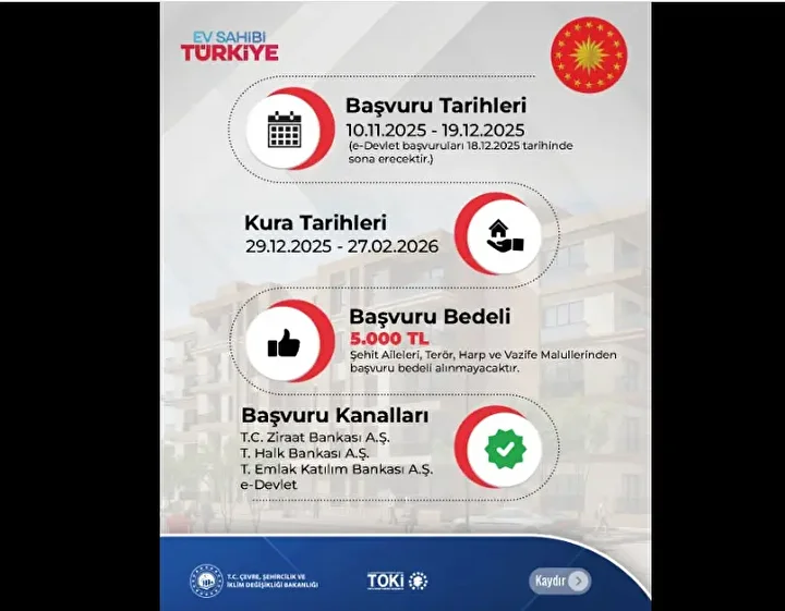 500 bin TOKİ konut başvurusu 10 Kasım-19 Aralık 2025 tarihlerinde; Halkbank ve Emlak Katılım Bankaları üzerinden e-Devlet aracılığı ile yapılacak. Hak sahibi belirleme kuralarının çekimi 29 Aralık 2025-27 Şubat 2026 arasında yapılacak. Konutlar Mart 2027 itibarıyla teslim edilmeye başlayacak.
