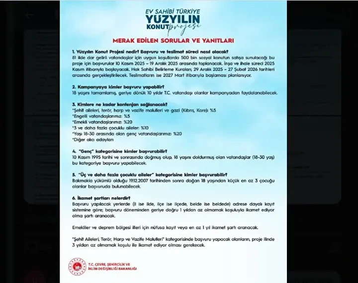 Başvurular 10 Kasım-19 Aralık 2025 tarihlerinde; Halkbank ve Emlak Katılım Bankaları üzerinden e-Devlet aracılığı ile yapılacak. Hak sahibi belirleme kuralarının çekimi 29 Aralık 2025-27 Şubat 2026 arasında yapılacak. Konutlar Mart 2027 itibarıyla teslim edilmeye başlayacak.