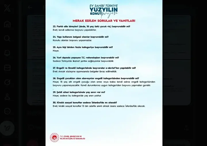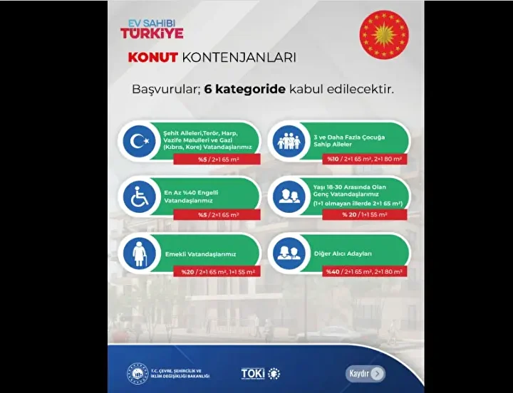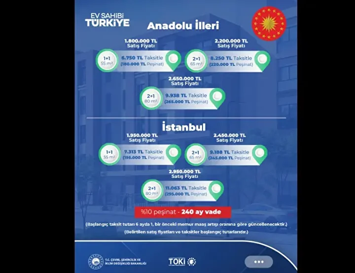 TOKİ 500 bin sosyal konut projesinde start veriliyor. TOKİ konutları için başvurular 10 Kasım-19 Aralık 2025 tarihlerinde; Halkbank ve Emlak Katılım Bankaları üzerinden e-Devlet aracılığı ile yapılacak. İstanbul için; hane halkı aylık net geliri en fazla 145 bin TL olanlar başvuruda bulunacak. Konutlar 55, 65 ve 80 metrekarelik tiplerde olacak. Tüm konutlar %10 peşinat, 240 ay vade ile satışa sunulacak. Konut fiyatları İstanbul ve Anadolu illeri için farklı olacak. Peki TOKİ 500 bin sosyal konut projesinde İstanbul fiyatları ne kadar olacak? İstanbul’da 55, 65 ve 80 metrekarelik TOKİ sosyal konutları kaç TL’den satışa sunulacak, ödeme planı nasıl?