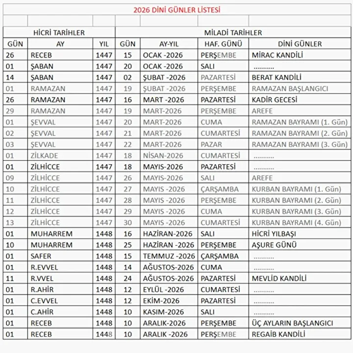 Bu tarihlerle birlikte, Müslümanların manevi hazırlık süreci Aralık ayından itibaren başlayarak 2026 Ramazan’ına kadar uzanacak.