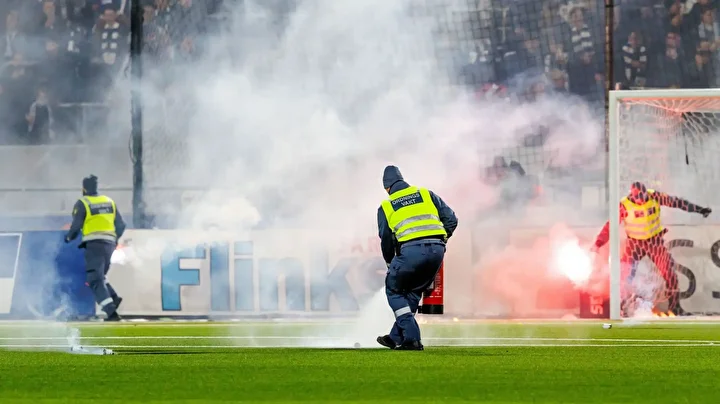 İlk maçı 3-0 kaybeden Norrköping'in sahasında oynanan rövanş mücadelesinde, takımlarının küme düşmesine tepki gösteren ev sahibi ekibin taraftarları 85. dakikada suni çim zemine yanıcı madde atmaya başladı.