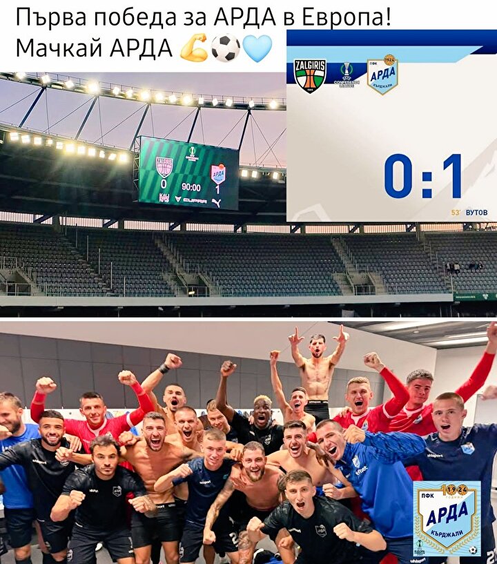 Bulgaristan'daki Türk takımı Arda Kırcaali, tarihinde ikinci defa katıldığı Avrupa kupalarında yürüyüşüne devam ediyor. İlk eleme turunda Helsinki'yi mağlup eden ekip, 3. ön eleme turunda da Litvanya takımı Zalgiris'i Antonio Vutov'un golüyle 1-0 mağlup etti.
