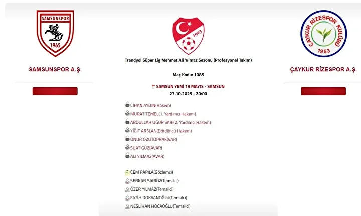 Samsunspor-Çaykur Rizespor maçında görev yapan hakemlerin listesi.