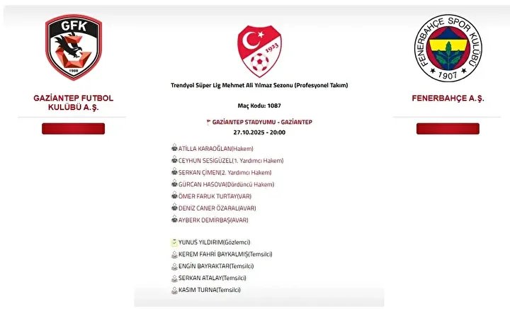 Gaziantep-Fenerbahçe maçında görevli olan hakem ekibinin ve Atilla Karaoğlan ile ilgili olumsuz bir durumun olmadığı aktarıldı.