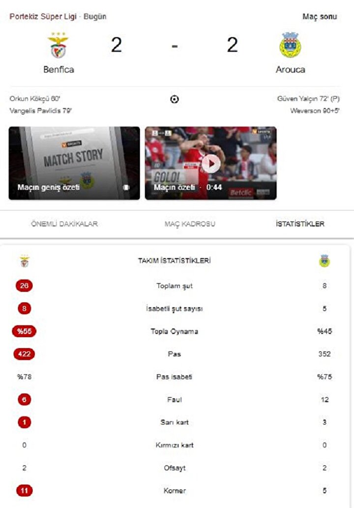 Portekiz Ligi'nde Arouca ile karşılaşan Benfica, şampiyonluk yolunda kritik bir maça çıktı. Orkun Kökçü ve Kerem Aktürkoğlu'nun formasını giydiği Benfica, son dakikalarda yediği gol sebebiyle önemli bir puan kaybı yaşadı. Benfica'nın puan kaybına Beşiktaş'ın eski futbolcusu Güven Yalçın da attığı golle katkı sağladı.