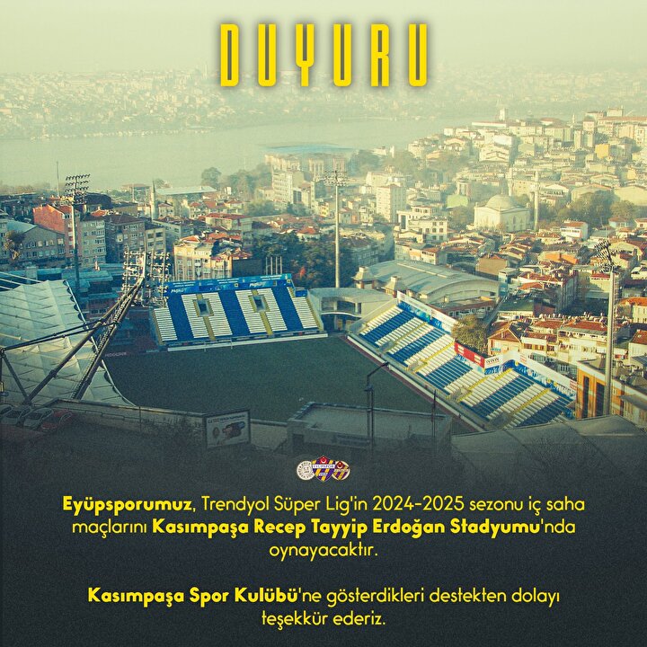 Eyüpspor'dan yapılan açıklama şöyle; yüpsporumuz, Trendyol Süper Lig'in 2024-2025 sezonu iç saha maçlarını Kasımpaşa Recep Tayyip Erdoğan Stadyumu'nda oynayacaktır.