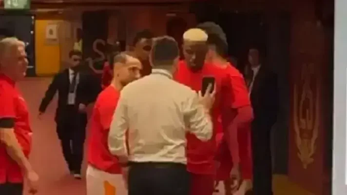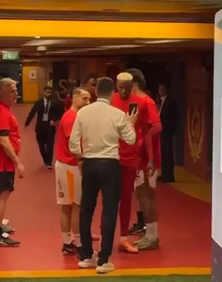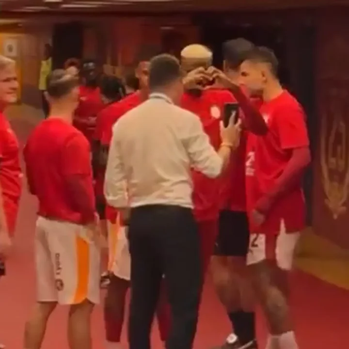 Galatasaraylı futbolcular, Göztepe maçı öncesi soyunma odası tünelinde sürpriz bir telefon görüşmesi gerçekleştirdi. Yayıncı kuruluş o anları paylaştı.