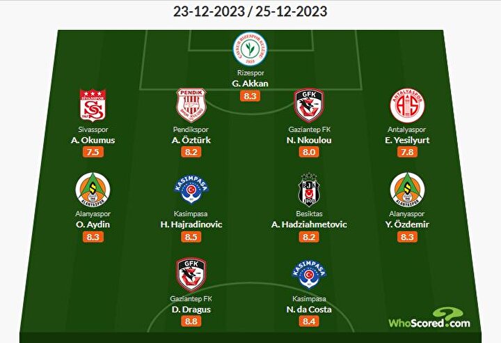 Süper Lig'de 18. haftanın 11'i belli oldu. İstatistik sitesi WhoScored'un verilerine göre belirlenen kadroda Gaziantep FK, Kasımpaşa ve Alanyaspor'dan ikişer futbolcu yer aldı. Beşiktaş'tan bir ismin girdiği kadroda, Fenerbahçe-Galatasaray derbisinden oyuncu yer almadı.