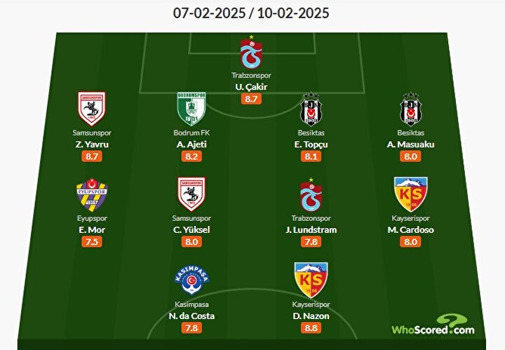 İstatistik sitesi WhoScored, Süper Lig'de 23. haftanın 11'ini belirledi. Beşiktaş, Trabzonspor, Kayserispor ve Samsunspor'dan ikişer oyuncu kadroya girdi. İşte haftanın 11'i: