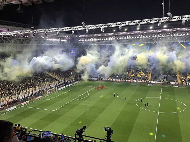 Görüş mesafesini bir anda düşüren yoğun duman, stattaki atmosferi maç başlamadan hareketlendirdi.