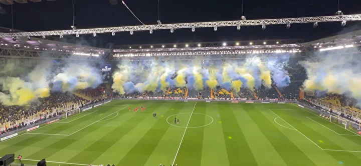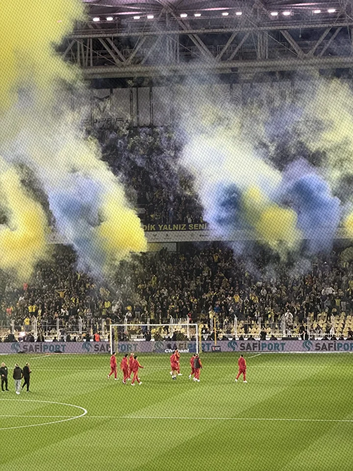Derbi öncesi Kadıköy’de sahaya çıkan Galatasaraylı futbolcular, bir anda tribünlerden yükselen sarı-lacivert dumanlar arasında kaldı.