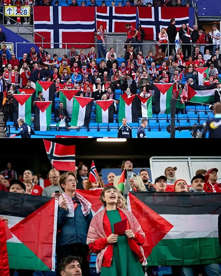 Norveçli taraftarlar, federasyonun izin vermesiyle stada Norveç ve Filistin bayraklarıyla gelerek desteklerini sürdürdü.