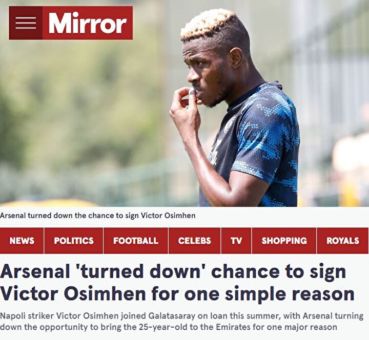 The Mirror'da yer alan habere göre Osimhen'i kadrosuna katmak isteyen Arsenal, Napoli'nin fiyat yükseltmesi üzerine masadan kalktı.
