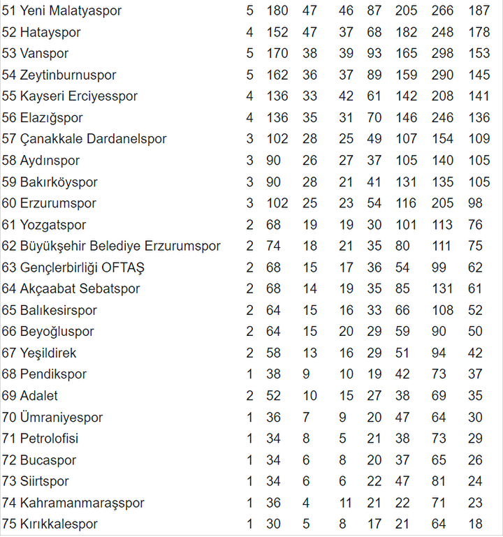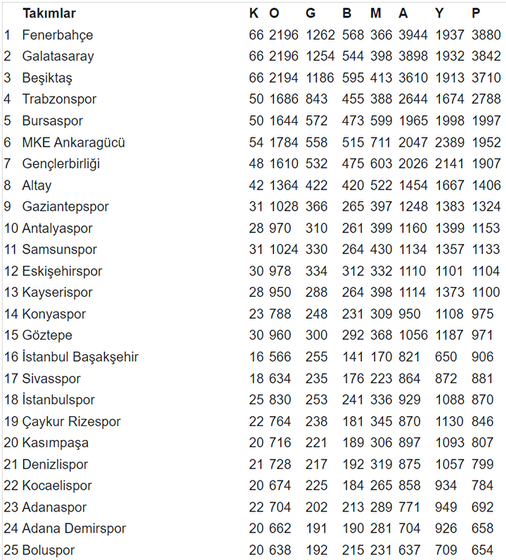 Galatasaray ise 2 bin 196 maçta toplam 3 bin 842 puan elde etti. Sıralamada Beşiktaş 3 bin 710 puanla üçüncü, Trabzonspor da 2 bin 788 puanla dördüncü sırada kendisine yer buldu.