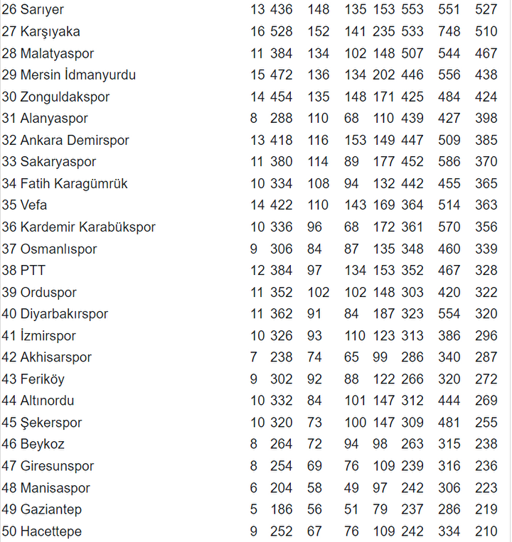 Fenerbahçe 2007 averajla başı çekerken, Galatasaray 1966, Beşiktaş 1697, Trabzonspor 970, İstanbul Başakşehir 171, Alanyaspor 12, Eskişehirspor 9 ve Sarıyer 2 averaja sahip.