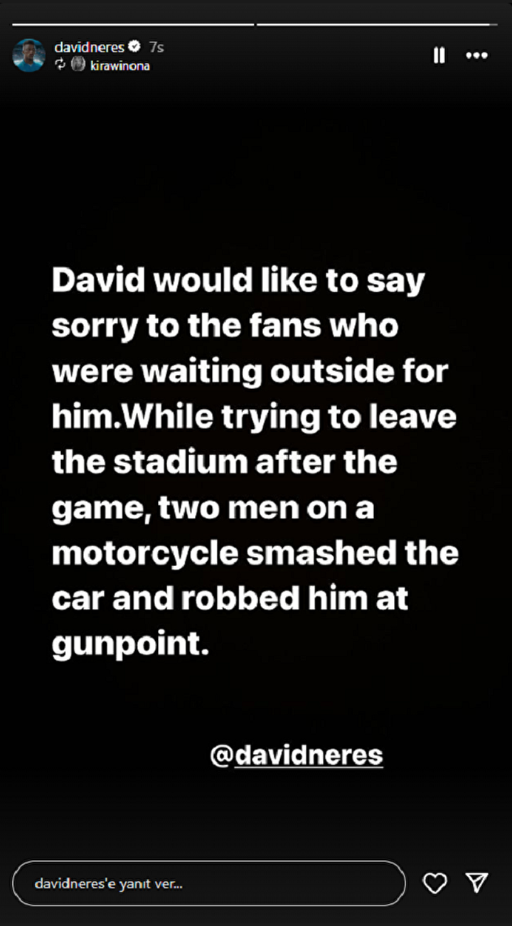 "Bizi stadın dışında bekleyen tüm taraftarlardan özür diliyorum. Eve dönerken bir soyguna maruz kaldık: Motosikletli iki adam minibüsün camını kırdı ve silah zoruyla bizden bir saat çaldı."