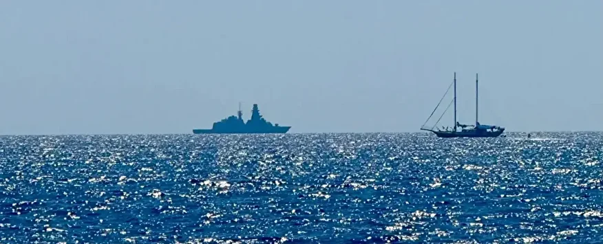 Le navire de guerre envoyé par l’Italie après les attaques de drones d’il y a deux soirs pour protéger ses citoyens présents dans la Flottille Sumud est arrivé au large de nos côtes. On pouvait le voir à l’œil nu, mais je l’ai observé longuement avec des jumelles.