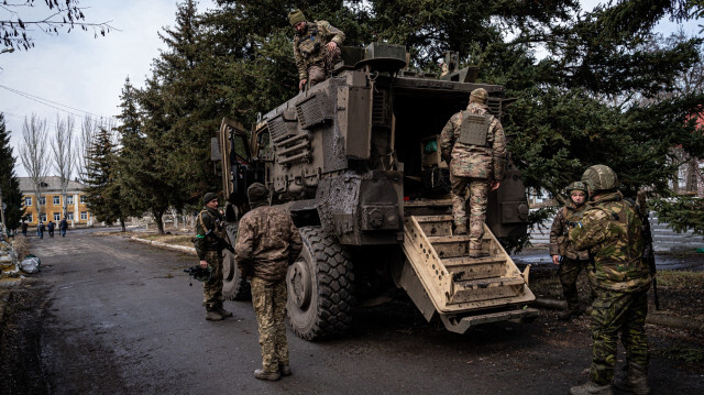 Des militaires ukrainiens descendent d'une voiture blindée. Ces hommes en armes vont être déployés sur la ligne de front de Bakhmut, dans la localité de Chasiv Yar. Alors que la lutte pour Bakhmut se poursuit dans une intense férocité, ces hommes font partie des renforts envoyés par le gouvernement afin de tenir la ville contre les forces russes.