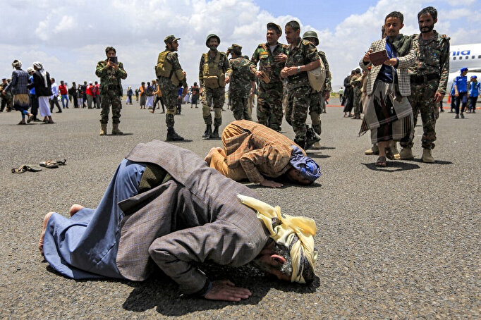 Sous la supervision des autorités gouvernementales, de grands bus blancs se sont arrêtés avec à leur bord des prisonniers Houthis en robes et turbans traditionnels, emportant de petits sacs à dos ou quelques affaires, avant d'embarquer dans l'avion qui les emmène à Sanaa.