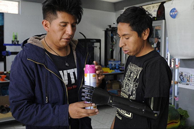 Entouré de prothèses et de dinosaures en 3D, Roly Mamani vérifie le bras articulé qu'il vient de concevoir. Depuis six ans, cet ingénieur de 34 ans met sa créativité de fabricant de jouets au service des amputés les plus démunis de Bolivie.