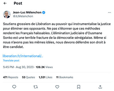 Le chef de file de LFI (La France insoumise), Jean-Luc Mélenchon, estime, dans une publication sur X, qu’