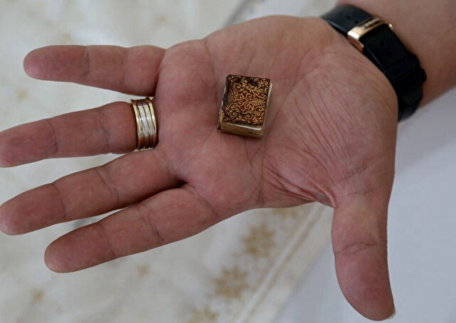 Le livre, dont la couverture est en velours brodé d'or, disparaît presque dans la paume de sa main. Il mesure 2,5 cm de long et 2 cm de large pour 1 cm d'épaisseur. On ne peut lire le texte en arabe qu'avec la petite loupe incrustée dans le couvercle même de sa boîte.