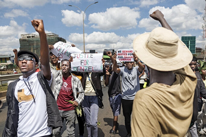 Des étudiants de l'université Jomo Kenyatta d'agriculture et de technologie (JKUAT) portent des affiches lors d'une manifestation demandant justice pour la mort de leur camarade Denzel Omondi Onyango, étudiant en architecture à la JKUAT, à la suite de manifestations anti-gouvernementales meurtrières il y a deux semaines, à Nairobi, le 12 juillet 2024.