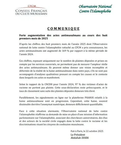 L'Observatoire national de lutte contre l'islamophobie en France alerte sur une augmentation alarmante de 169% des actes antimusulmans durant les huit premiers mois de 2025 par rapport à 2024. Ces statistiques, basées uniquement sur les plaintes déposées, ne reflètent qu'une partie de la réalité. La CNCDH rappelle que 97% des victimes de racisme ne portent pas plainte. Face à cette situation préoccupante et à la hausse des signalements en ligne sur PHAROS, l'Observatoire demande la création d'une mission parlementaire associant chercheurs, élus et société civile pour combattre l'islamophobie.