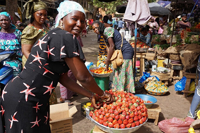 Des femmes vendant des fraises sur un marché ouvert à Ouagadougou.