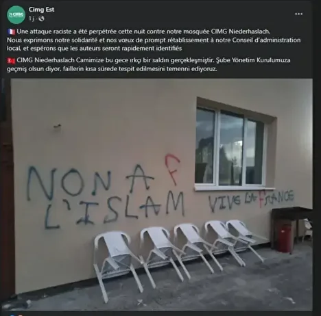 La mosquée de Niederhaslach, affiliée à la Confédération islamique Milli Görüs (CIMG), a été victime d'une attaque islamophobe dans la nuit du mardi 14 au mercredi 15 octobre 2025. Des inscriptions haineuses mentionnant "non à l'islam" et "vive la France" ont été découvertes sur les murs du lieu de culte alsacien. Musulmans de France a immédiatement condamné cet acte et apporté son soutien à la communauté locale et à la direction de la CIMG Est. Une plainte a été déposée et les autorités enquêtent pour identifier les auteurs de ces dégradations.