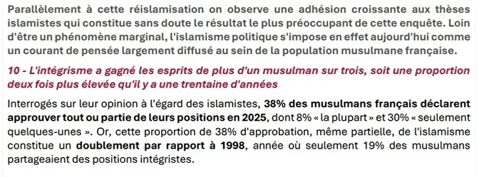 "cette enquête dessine très nettement le portrait d'une population musulmane traversée par un processus de réislamisation, structurée autour de normes religieuses rigoristes et tentée de plus en plus par un projet politique islamiste."