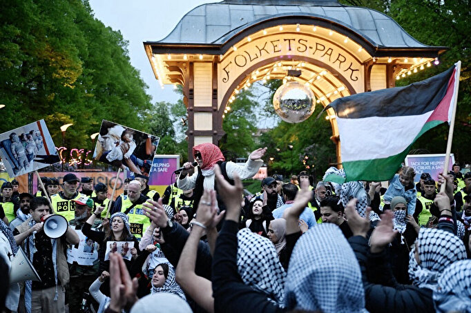 La manifestation à Malmö, en Suède, pour protester contre la participation d'Israël à la 68e édition du Concours Eurovision de la chanson (CES), le 9 mai 2024.