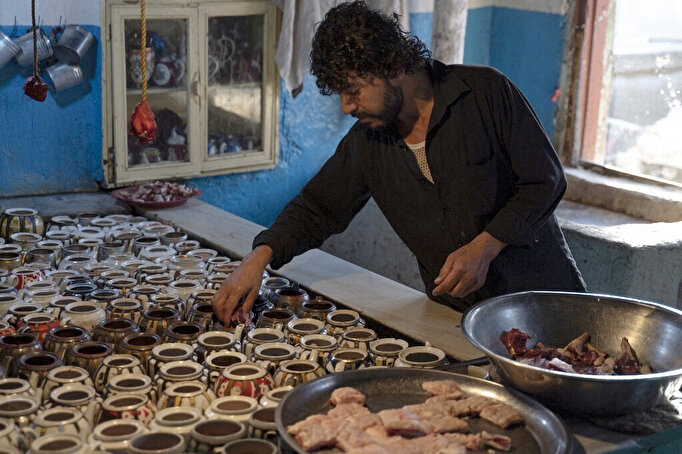 À l'arrière de son restaurant de Kaboul, Waheed, un des derniers cuisiniers à maîtriser la recette du "chainaki", répartit les morceaux de viande et de graisse de mouton parmi les quelque 200 théières dépareillées dans lesquelles ils mijoteront plusieurs heures.