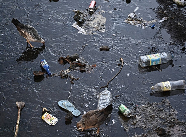 Bouteilles de détergent, bidons, pots de yaourt, sacs de bonbons, couvercles, sandales... un inventaire à la Prévert de la consommation moderne.