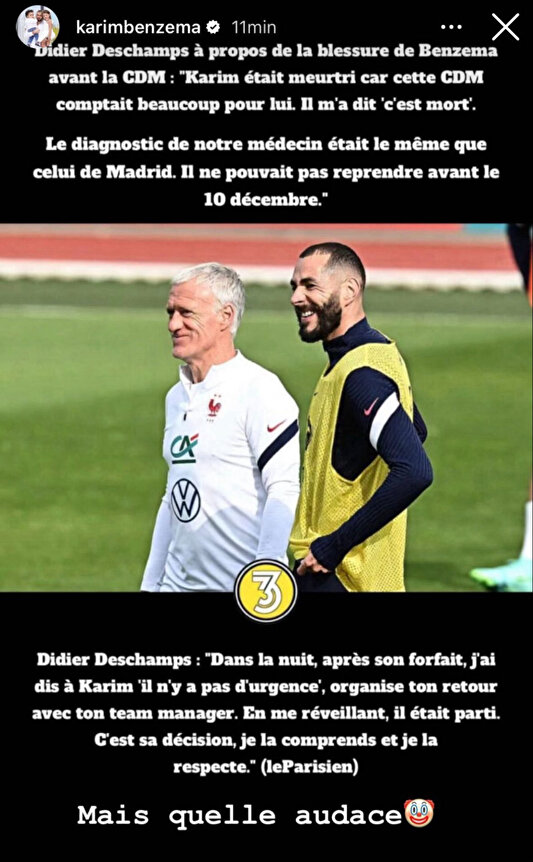 "Quand Karim s'est blessé, notre médecin l'a accompagné à la clinique Aspetar pour passer une IRM, a également raconté Deschamps. Karim a transmis les résultats à quelqu'un qui le suit à Madrid et qui lui a également donné un avis. Quand il est rentré à l'hôtel, il était déjà plus de minuit. J'ai rejoint Karim dans sa chambre avec notre docteur qui était venu me faire le compte rendu de l'IRM (...) Karim est meurtri car cette Coupe du monde représentait beaucoup pour lui. Il me dit: C'est mort."