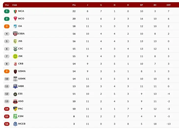 Classement de la Ligue 1 algérienne après la 11e journée du championnat