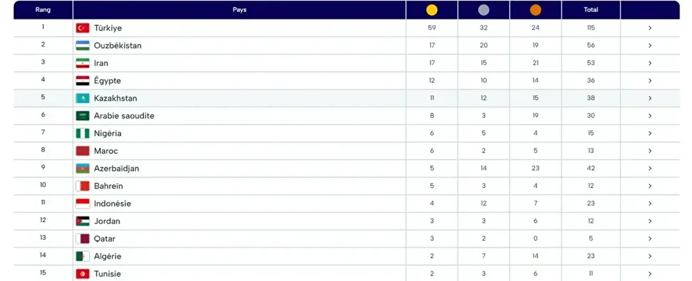 L'Iran et l'Egypte se disputent actuellement la 3e place de ce classement, avec respectivement 53 (17 or, 15 argent, 21 bronze) et 36 (12 or, 10 argent, 14 bronze) médailles.