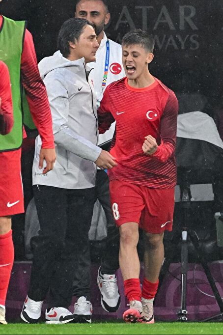 L'attaquant de la Turquie Arda Guler réagit avec l'entraîneur italien de la Turquie Vincenzo Montella à la fin du match de football du groupe F de l'UEFA Euro 2024 entre la Turquie et la Géorgie au BVB Stadion à Dortmund, le 18 juin 2024.