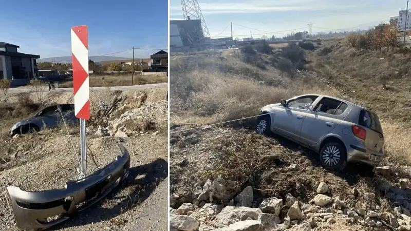 Yoldan çıkan otomobil taşlık alanda asılı kaldı