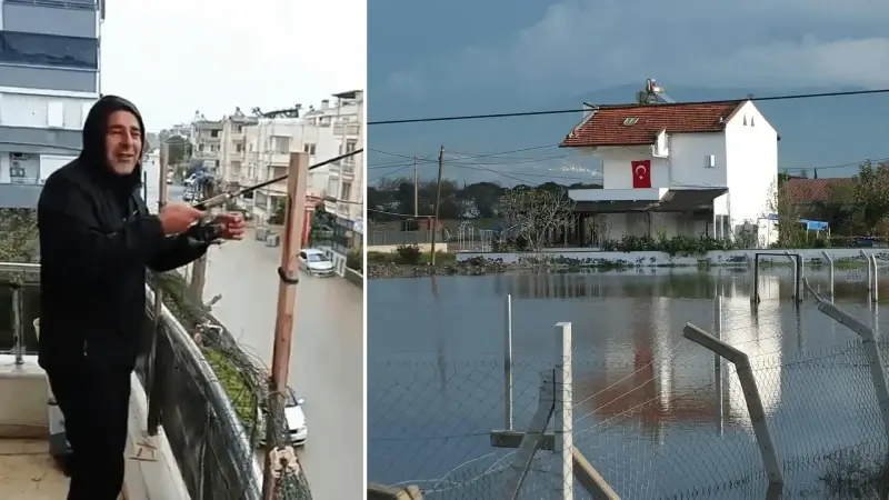 Balıkesir’de sağanak yağmur etkili oldu, yollar göle döndü, yazlıkları su bastı: Bir kişi balkonundan sokağa olta attı