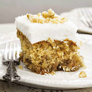 Kalan kek malzemeleri sırasıyla ilave edip karıştırın. Büyük boy yağlanmış bir borcama harcı yayın. Önceden ısıtılmış 170 derecelik fırında kürdan batırdığınızda temiz çıkana kadar pişirin.
