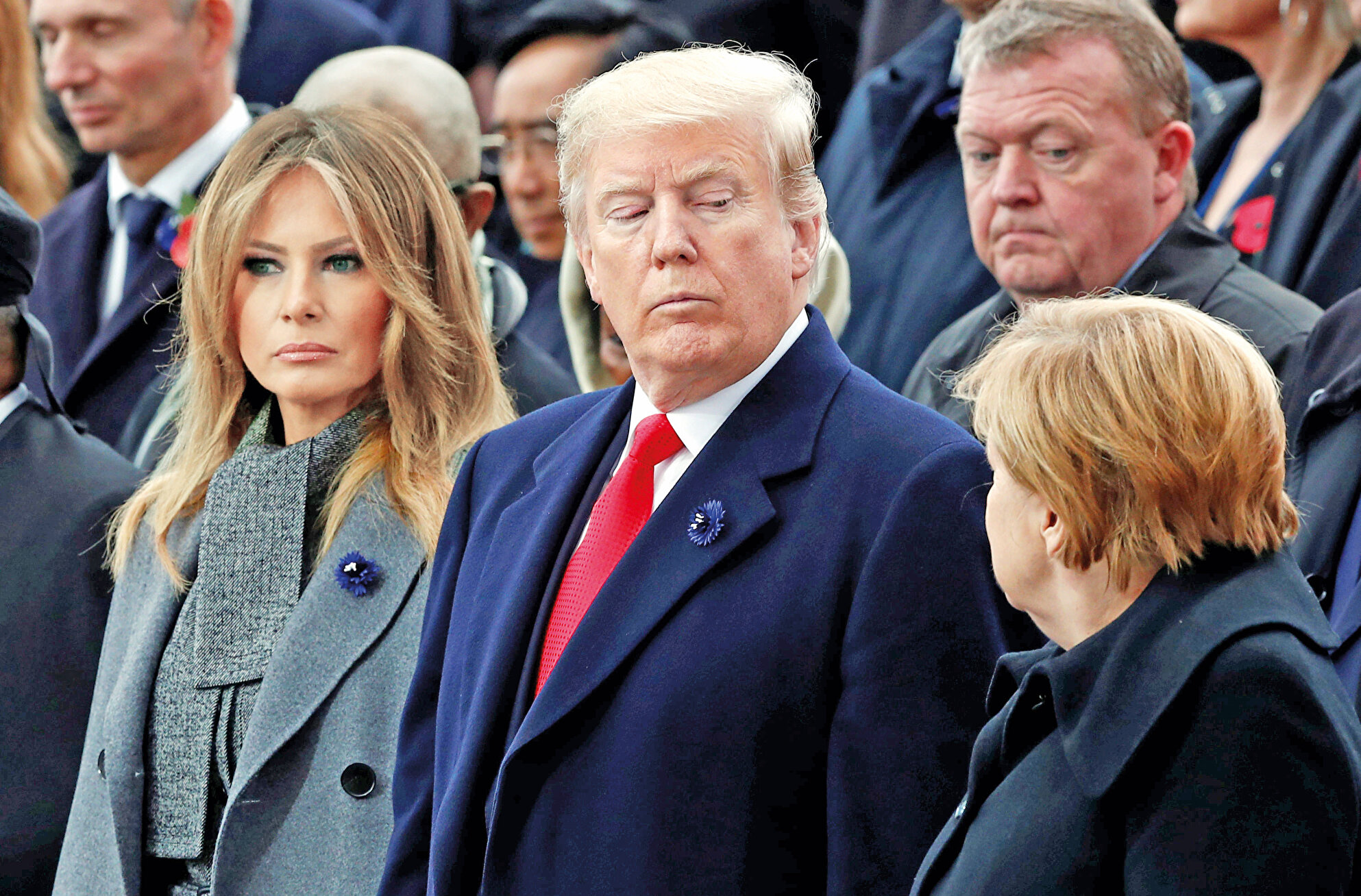 - Buradan 47 devlet başkanı, 23 hükümet başkanı, 15 uluslararası kuruluşun başkanı ve beraberindeki eşleri, kendileri için hazırlanan otobüslerle Şanzelize Caddesi’ne giderek Zafer Takı ile Meçhul Asker Anıtı’na yürüdü. Elize Sarayı’ndaki karşılamaya gelmeyen Rusya Devlet Başkanı Vladimir Putin ve ABD Başkanı Donald Trump ile eşi Melania Trump, kendi makam araçlarıyla anma törenine iştirak etti. Kendileri için ayrılan ‘Başkanlar Tribünü’ne geçen liderler ve eşleri, saygı duruşunda bulunup anma törenini izledi. Yaklaşık 2 saat süren anma töreni sonrasında liderler ve eşleri, Macron ve eşinin verdiği öğle yemeğine iştirak etti.