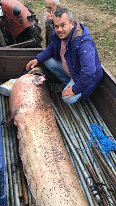 Bursa’da iki balıkçı 120 kiloluk dev yayın balığı yakaladı. Balıkçılar, römorkla taşınabilen balığın yanında yatarak fotoğraf çekildi. Daha önce İznik gölünde bu büyüklükte bir balık tutulmadığını söyleyen iki kardeş, yayın balığını traktör römorkuna koyarak taşıdı.