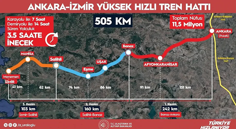 Ankara-İzmir hızlı tren projesinin tamamlanması ile mevcut demiryolu bağlantısıyla 824 kilometre olan mesafenin 624 kilometreye ineceğine dikkati çeken Bakan Uraloğlu, “Ankara-İzmir arası hat uzunluğu 624 kilometre olacak. Ancak bizim çalışmalarımız Polatlı’ya kadar mevcut olan hızlı tren hattından sonra başladığı için Ankara-İzmir Yüksek Hızlı Tren Hattı kapsamında Ankara- Banaz, Banaz-Sahilli ve Salihli-İzmir kesimleriyle toplam 505 kilometre uzunluğunda bir prestij projesi inşa ediyoruz.” dedi.