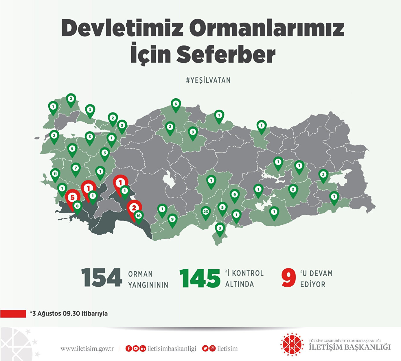 Bu arada, İletişim Başkanlığı'ndan yapılan açıklamada yangınlarla mücadelenin devam ettiği, devletin ormanlar için seferber olduğu duyuruldu.