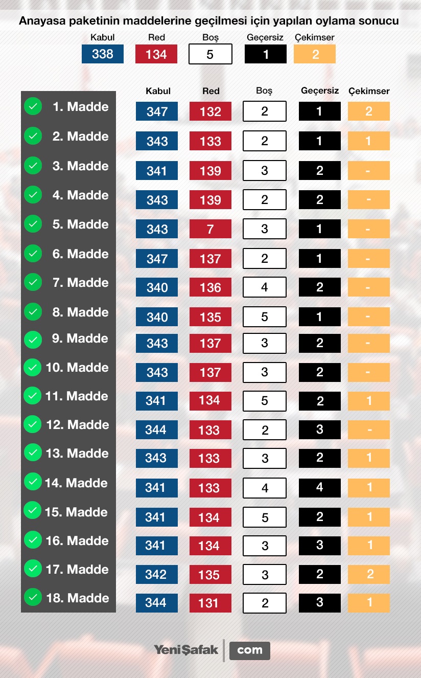 Teklifin 18 maddesi sırasıyla, 347, 343, 341, 343, 343, 343, 340, 340, 343, 343, 341, 344, 343, 341, 341, 341, 342, 344 'evet' oyuyla geçti.