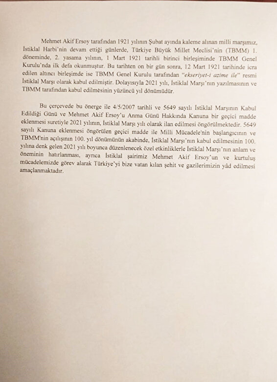 "Kanuna eklenmesi öngörülen geçici maddeyle Milli Mücadele'nin başlangıcının ve TBMM'nin açılışının 100. yılının akabinde, İstiklal Marşı'nın kabul edilmesinin 100. yılına denk gelen 2021 boyunca düzenlenecek özel etkinliklerle İstiklal Marşı'nın anlam ve öneminin hatırlanması, ayrıca İstiklal Şairi Mehmet Akif Ersoy'un ve kurtuluş mücadelemizde görev alarak Türkiye'yi bize vatan kılan şehit ve gazilerimizin yad edilmesi amaçlanmaktadır."