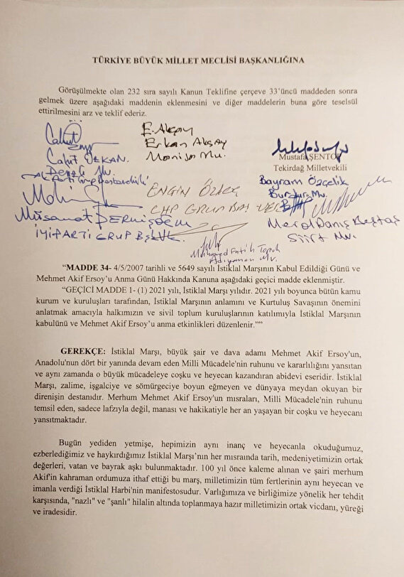 TBMM Genel Kurulunda, Meclis Başkanı Mustafa Şentop'un ilk imza sahibi olduğu ve AK Parti, CHP, HDP, MHP ve İYİ Parti'nin imzasının yer aldığı önergeyle 2021 yılının "İstiklal Marşı Yılı" olmasını içeren düzenleme kabul edildi. 2021 yılı boyunca bütün kamu kurum ve kuruluşlarınca İstiklal Marşı'nın kabulü ve Mehmet Akif Ersoy'u anma etkinlikleri düzenlenecek.