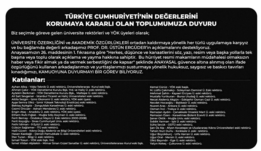 Kendilerine “seçilmiş rektörler” adını veren 38 eski rektör, Boğaziçi olaylarını organize ettiği öne sürülen üniversitenin eski rektörü Prof. Dr. Üstün Ergüder’e destek için ortak açıklama yaptı. Açıklamada üniversitelerin özerkliği ve akademik özgürlükten dem vurularak Anayasa’ya gönderme yapıldı. Anayasa’nın 26. maddesi dayanak gösterilerek herkesin fikir ve düşünce özgürlüğü olduğu dile getirilen açıklamada “Anayasal güvence altına alınmış olan ifade özgürlüğünü kullanan arkadaşlarımızı ve yurttaşlarımızı susturmaya yönelik hukuksuz, saygısız ve baskıcı tavırları kınıyoruz” denildi.