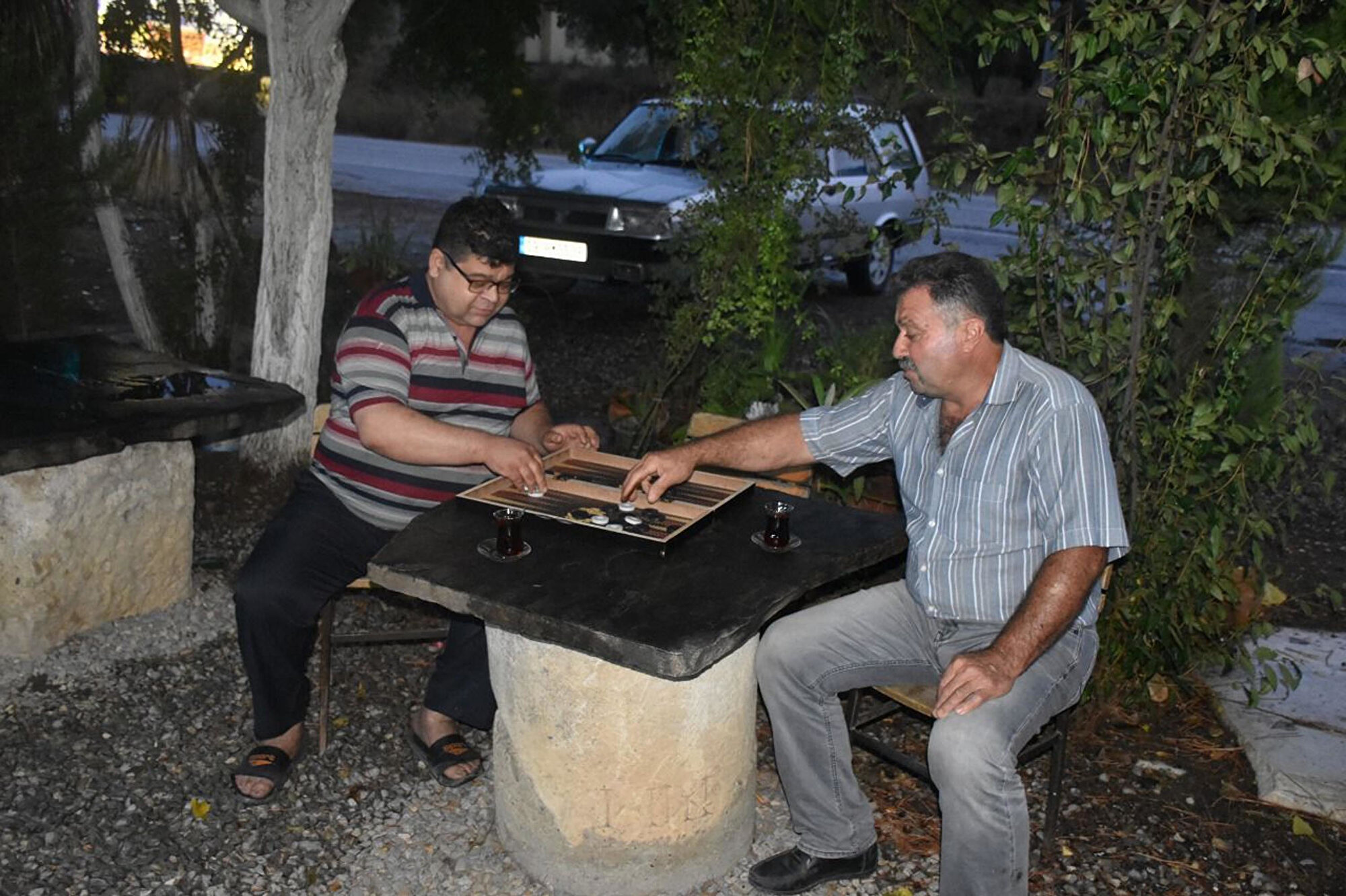 Aydın'ın Karacasu ilçesi Esençay Mahallesi'nde kahvehane işleten Zeynel Şenler, 35 yıl önce açtığı kahvehaneye dekor amacıyla koyduğu mermer taşın üzerine, üretim yaptığı kayrak taşını yerleştirdi.